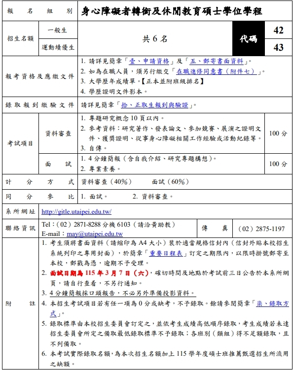 臺北市立大學身心障礙者轉銜及休閒教育碩士學位學程115學年度碩士班考試入學報名中